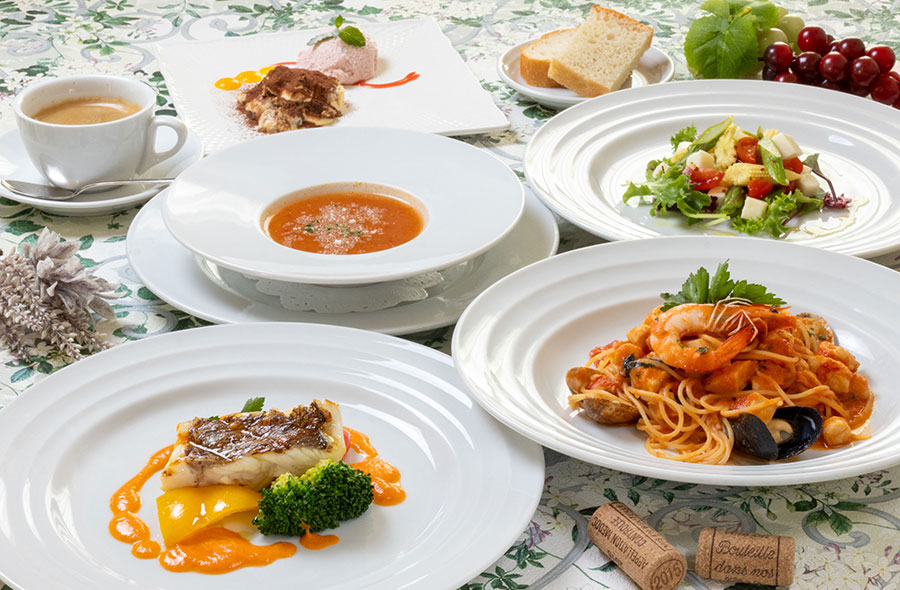 スープ、前菜、パスタ、メイン、デザートを楽しめる季節変わりのランチコース。お昼のお集りにおすすめ。春のコースのパスタは『カニ身とクリームソース 自家製タリアッテレ』です。
