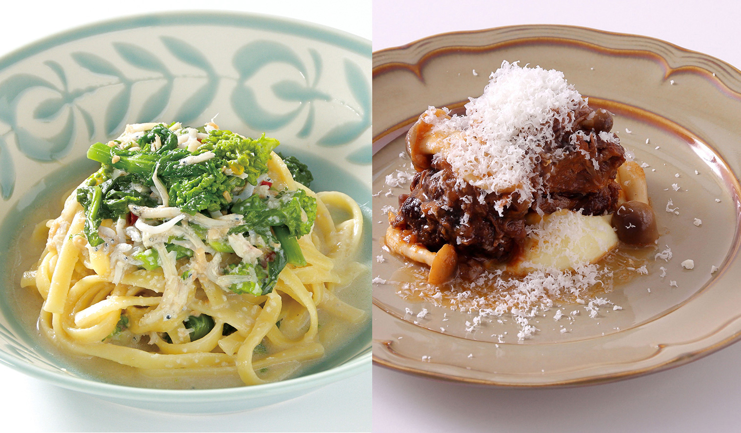 兵庫県産猪肉を使ったトマト煮込みは赤ワインと楽しみたい旨みたっぷりのごちそう煮込みです。菜の花とシラスを使ったタリアテッレとブルスケッタもご用意しました。