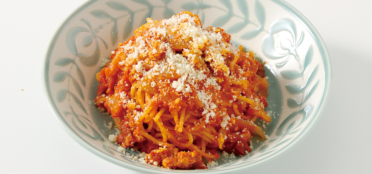 香ばしいベーコンとじっくり炒めた玉ねぎがトマトソースの甘酸っぱさを引き立てる王道パスタ。