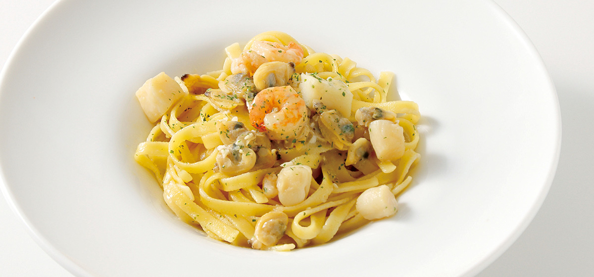 新鮮な海の幸をふんだんに使い、オリーブオイルで香り高く仕上げたタリアテッレ。