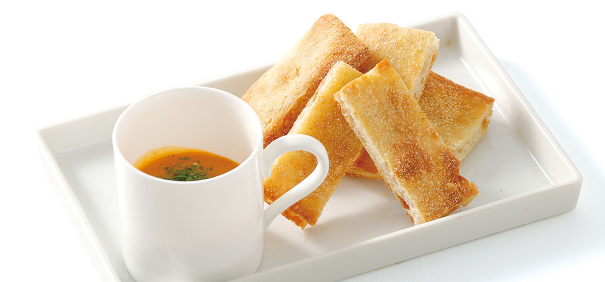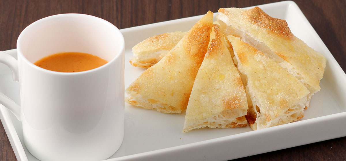 ガウダンテで人気の濃厚な伊勢海老のスープ。ピッツァビアンカ(生地に具材の乗せずに焼いたピッツァ)をディップしてお楽しみください。