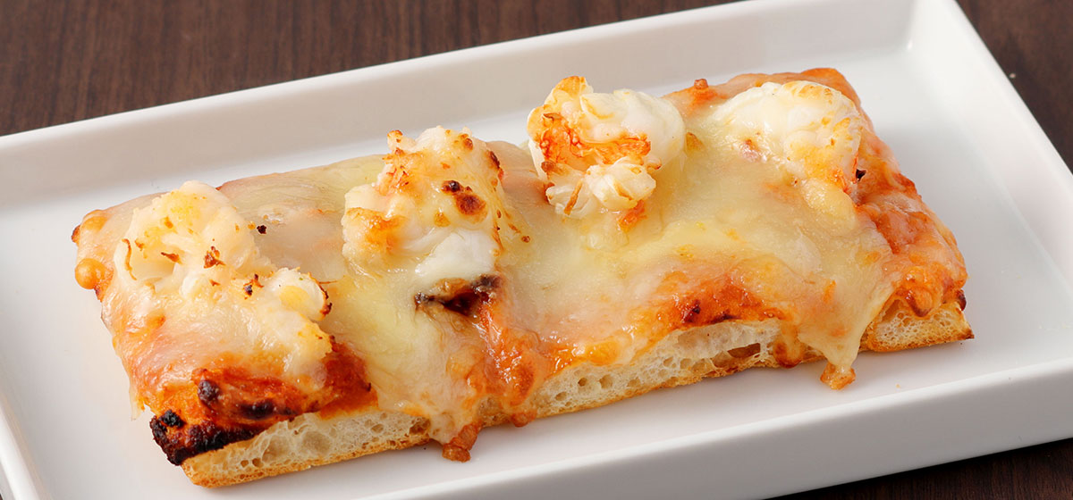 トマトソースにマリネした魚介3種をのせたブルスケッタ。色々味わいたい方へ。