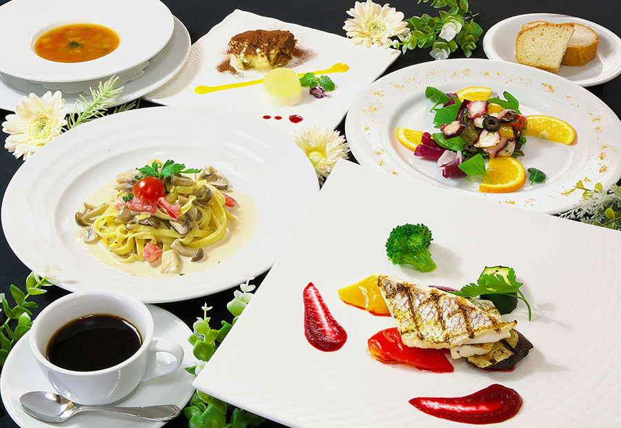 季節ごとにメニューが変わるおすすめランチコースです。 スープ、前菜、パスタ、メイン、ドルチェ、コーヒーがお楽しみいただけます。